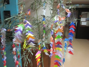 七夕飾りが完成しました。今年は入居者の皆さんと職員の頑張りで、